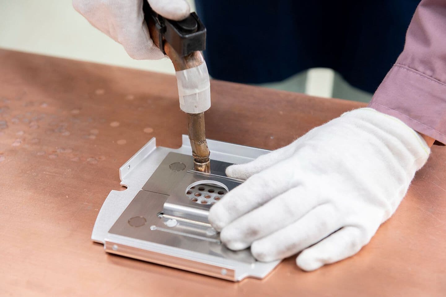 ファイバーレーザ溶接やテーブルスポット溶接では薄板の溶接もヤケレスで対応致します。