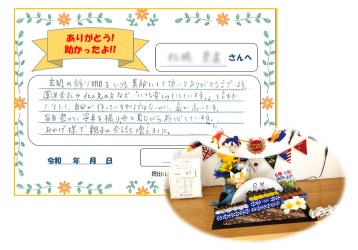 「玄関の飾り棚をいつも素敵にして頂いてありがとうございます。運送会社や仕入先の方などに『いつも楽しみにしています!』