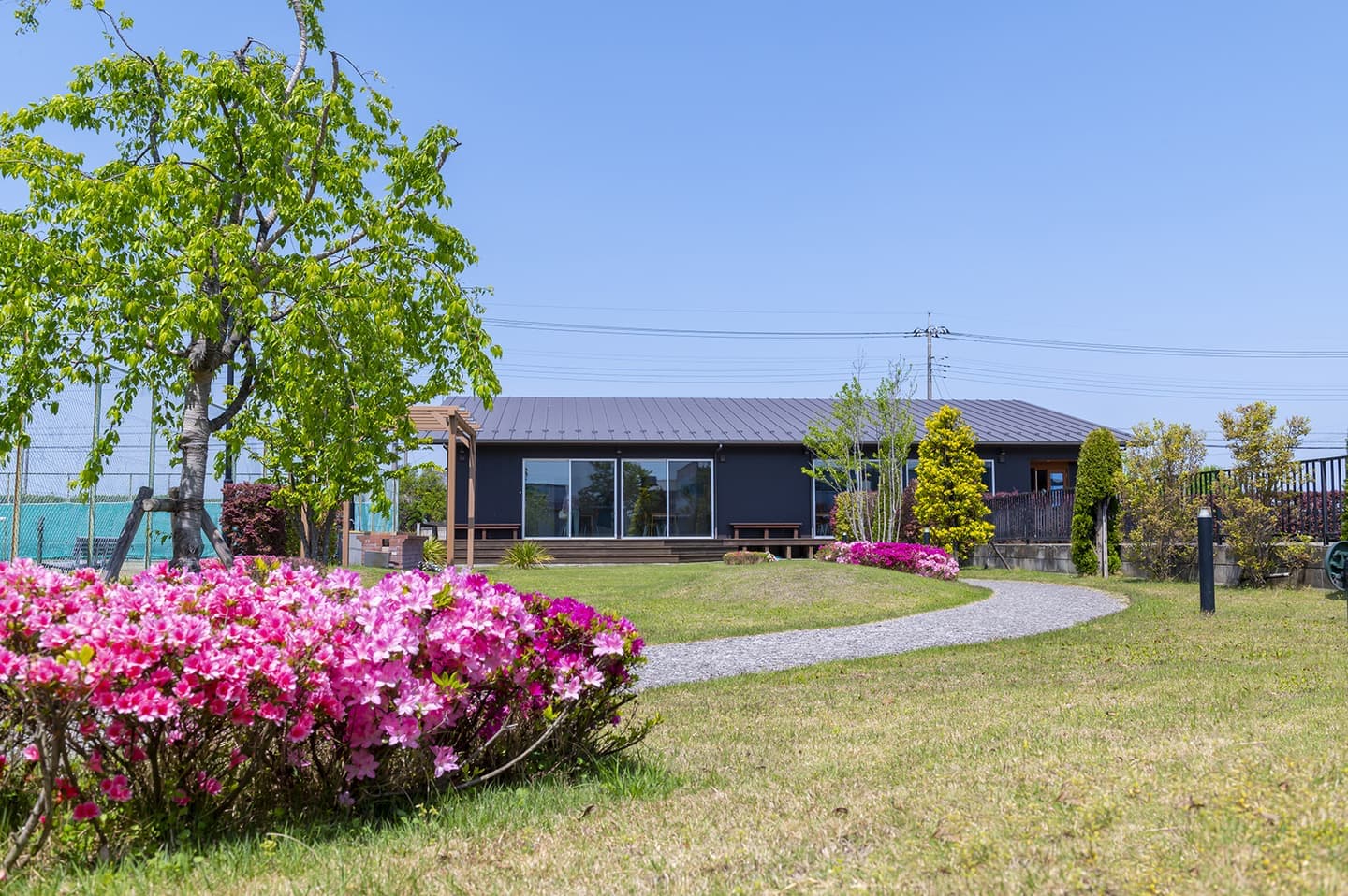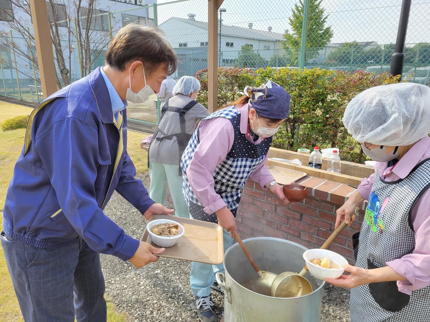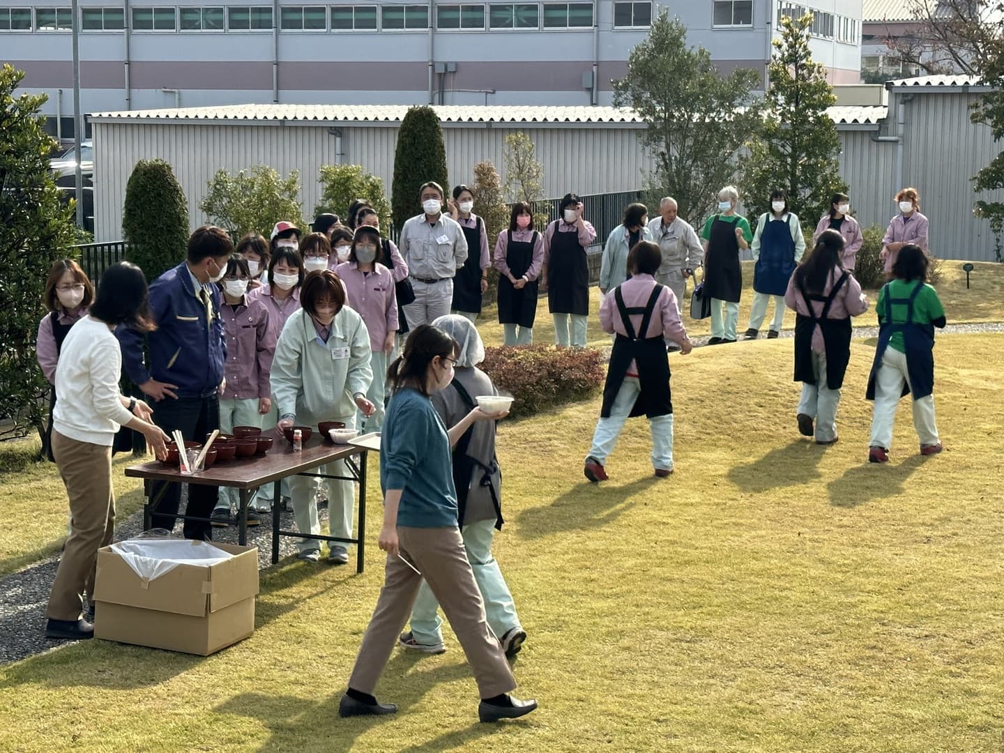 群馬事業所の奥行きのある芝生の上で振舞う、すいとん、冷や汁、三平汁、芋煮汁などに皆さん笑顔で日本の食を楽しんでいます。