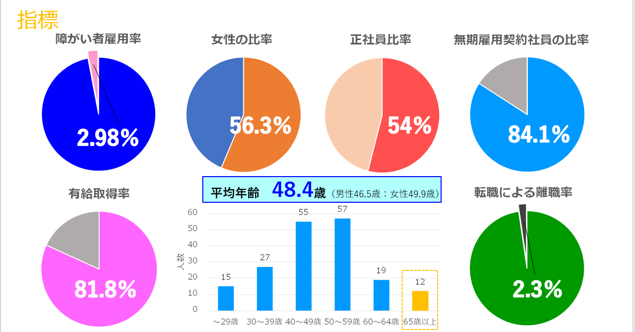 雇用率は3.0%ですが、聴覚に障がいをもつHさんは勤続43年、社員とのコミュニケーションも問題なく、働ける環境が自然と社風として身についています。